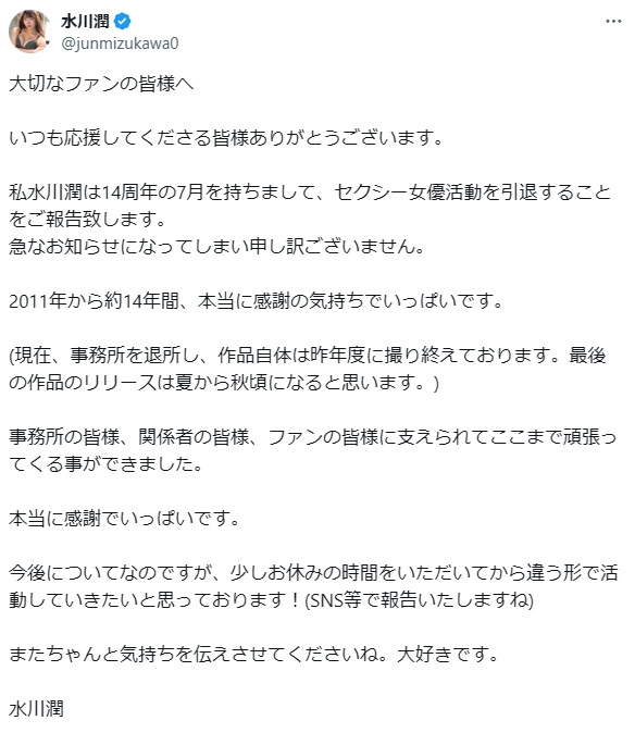 水川潤さん セクシー女優を活動7月で終了 ※PR