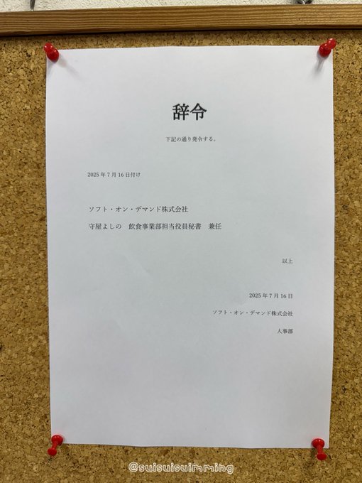 飲食事業部担当役員秘書兼任のお知らせ。新作でも退職でもなし。