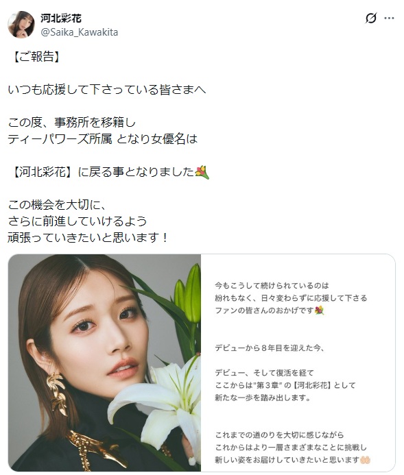 事務所移籍して、名前も河北彩花に戻るとのこと!