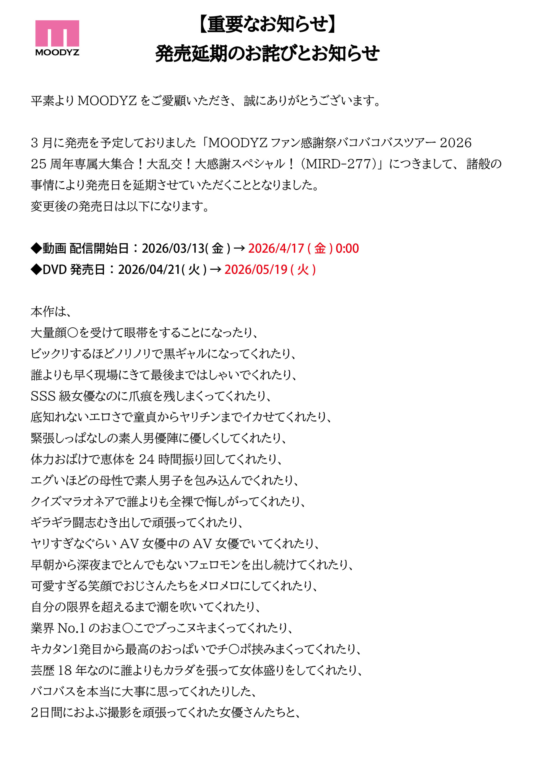 【動画】『MOODYZファン感謝祭バコバコバスツアー2026 25周年専属大集合!大乱交!大感謝スペシャル!』はこちら!
